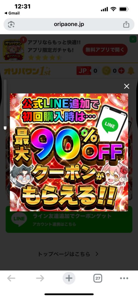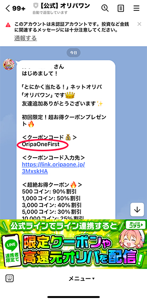 オリパワンLINE友だち追加で初回限定の最大90%オフのクーポンコードがもらえます。