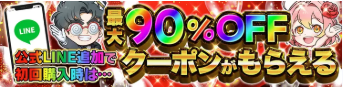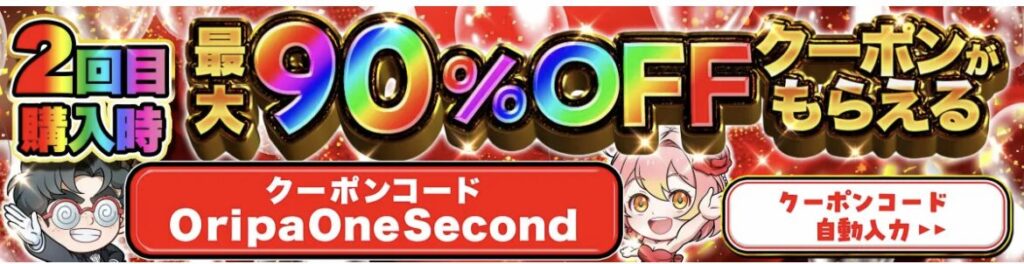 下記のバナー表示がある場合は、コイン購入2回目も最大90%オフで購入ができます。