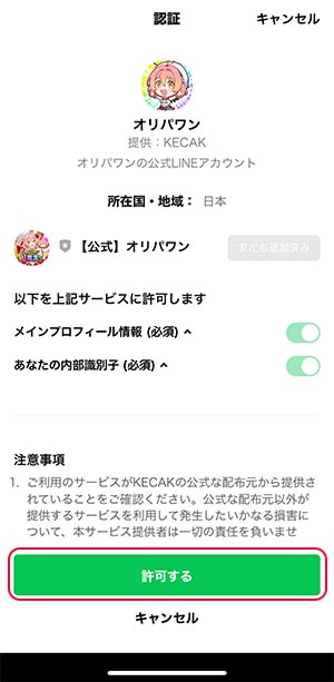 ② LINEの画面になりますので、下のバナーをタップしLINE連携を行います。