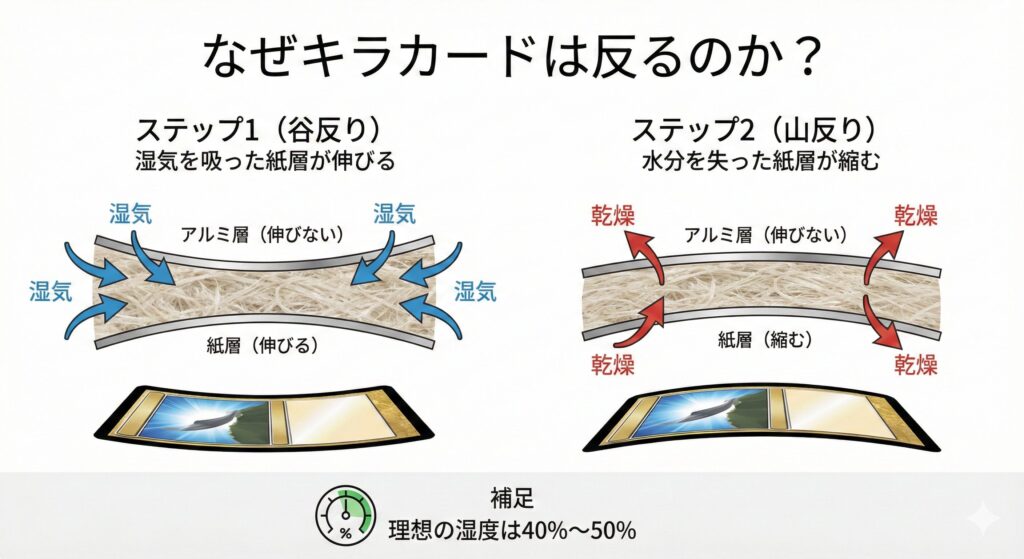 ポケモンカードのキラ仕様は、表面の「伸縮しないアルミ層」と、裏面の「湿気で伸縮する紙層」が重なった多層構造になっています。この紙層が周囲の相対湿度(RH)の変化に反応して伸び縮みすることで、アルミ層との間に歪みが生まれ、反りが発生するのです。