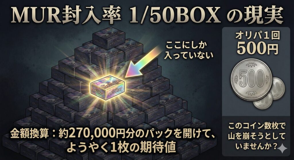 約50BOX(約27万円分)を開封して、ようやく1枚出るかどうかのカードを、数千円のオリパで当てようとするのは、統計的に見てあまりに無謀な戦いです。