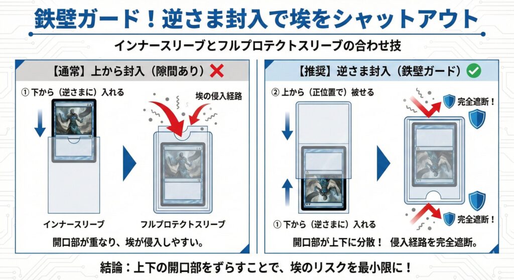 カードをスリーブに入れる際、上からではなく「下から(逆さまに)」入れてください。その上からフルプロテクトスリーブを正位置で被せることで、開口部が上下に分散され、埃の侵入経路を完全に遮断できます。