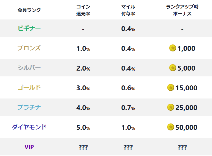 還元率 | コイン購入時に0~5%付与 | ポイント購入時に0~6%付与 | ポイント購入時に0~5%付与 マスターランクは非公開 | ー | ― | ― | ― |