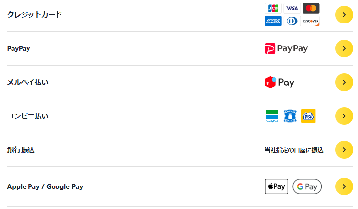 ”PayPay、銀行振込 、クレジットカード、コンビニ払い、メルペイ、Amazon Pay/Google Pay”