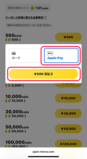 3) Google Payを登録していなかったので、自動的に Apple Payをタップ、”¥500支払う”をタップして支払い完了です。