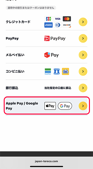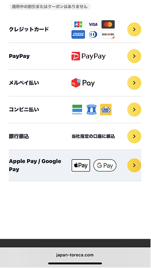 支払い方法は”クレジットカード、PayPay、メルペイ払い、コンビニ払い、銀行振込、Apple Pay/Google Pay”が利用できます。