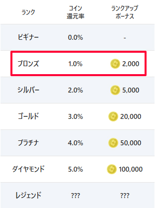 ブロンズ会員になるためには月に100,000コイン(万)の消費が必要となります。