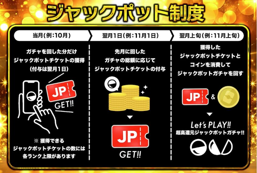 ジャックポットガチャとはJP(ジャックポット)チケット+コインで引けるガチャで、毎月1日の18時に開催しています。