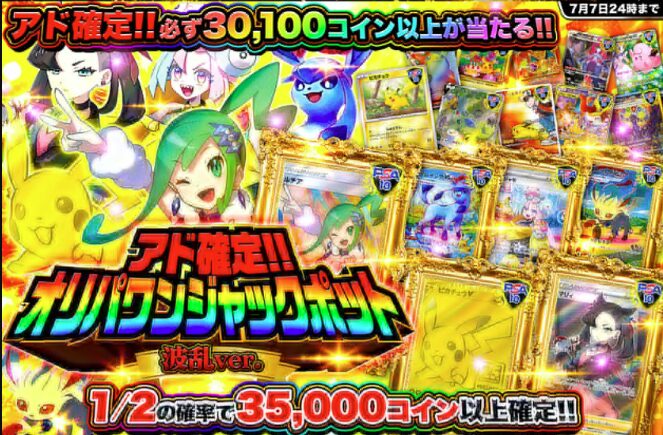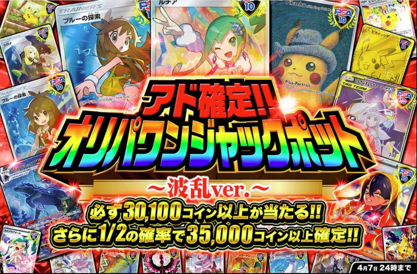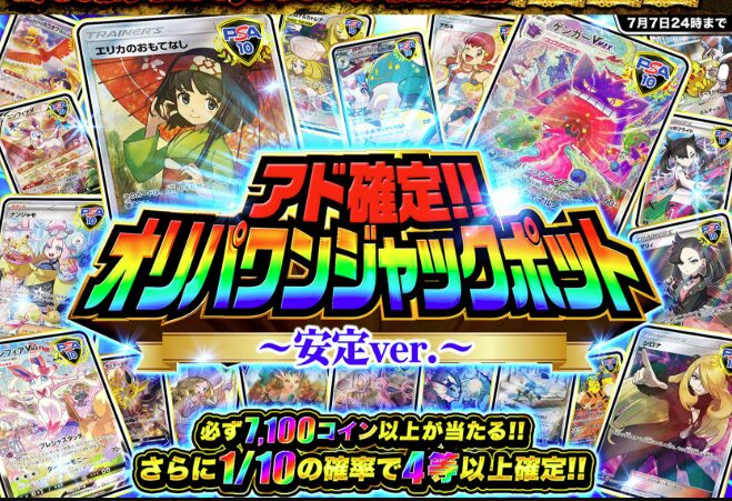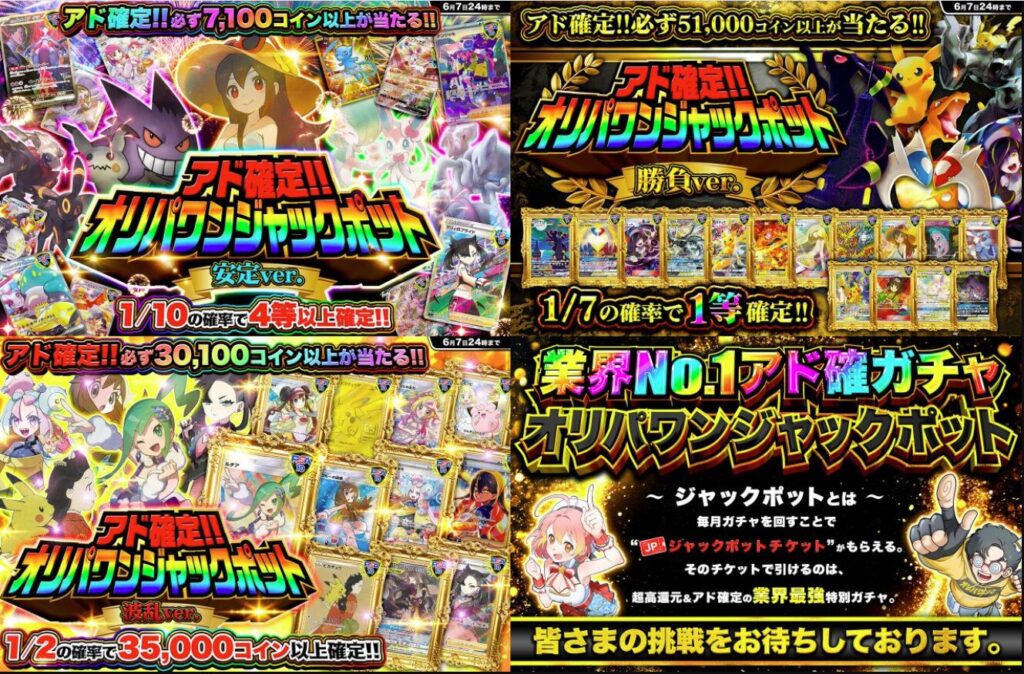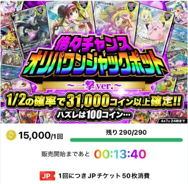 初回は課金をすることになると思いますが、”JPチケットでジャックポットガチャが引けると当たりでコインが貯まる→そのコイン消費してオリパを回せるようになるとJPチケットが貯まる”という形で繰り返しジャックポットガチャを引けるループなります。